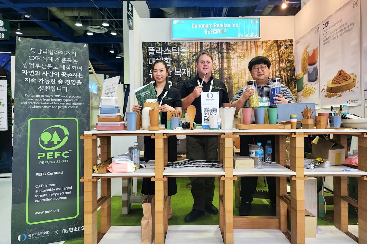 韓国の山林庁と国連食糧農業機関(FAQ)が共同で主管する世界山林総会(World Forestry Congress, WFC)は、最も影響力のある国際山林行事です。私たちは2022年に、山林庁から招待され参加しました。林業副産物として製作された多くの製品を披露し、PEFC認証熱可塑性無毒性CXP木材を世界的に広めることができる意味深い機会になりました。
