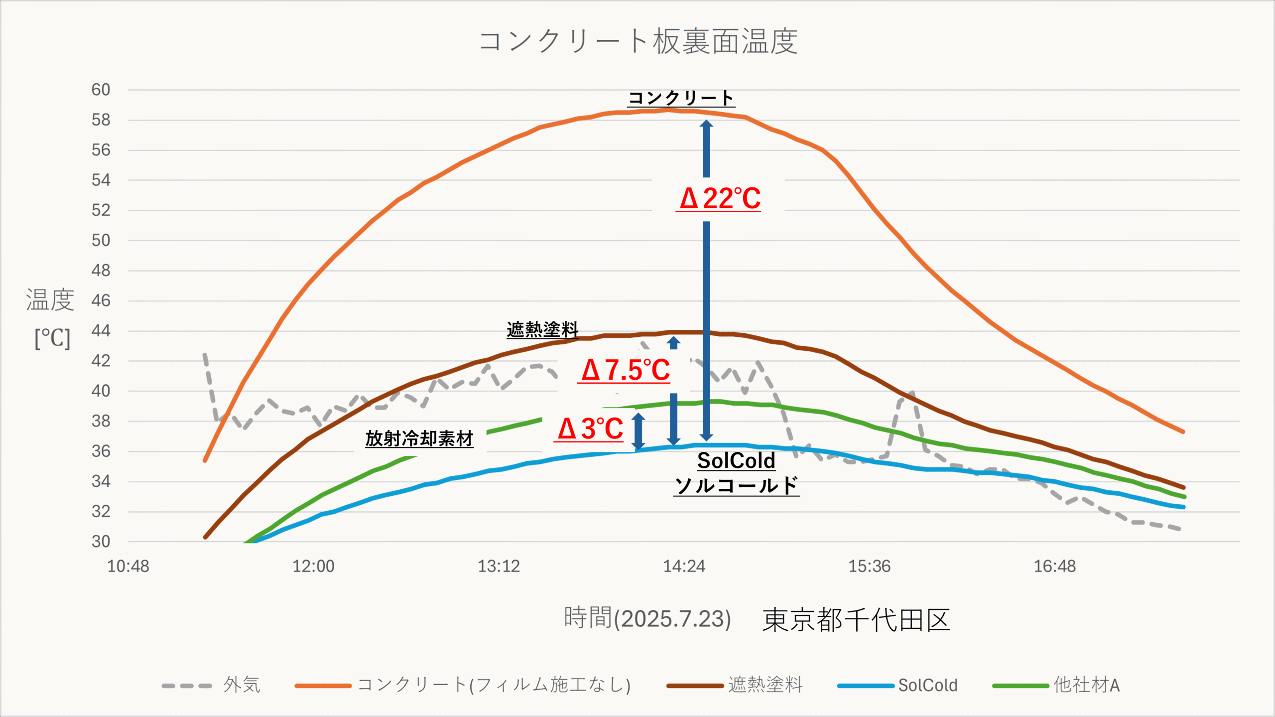 コンクリート表面にそれぞれSolCold 、他素材を施工したもの、何も施工していないものを並べて測定。環境条件により効果の大きさは変わることがあります。