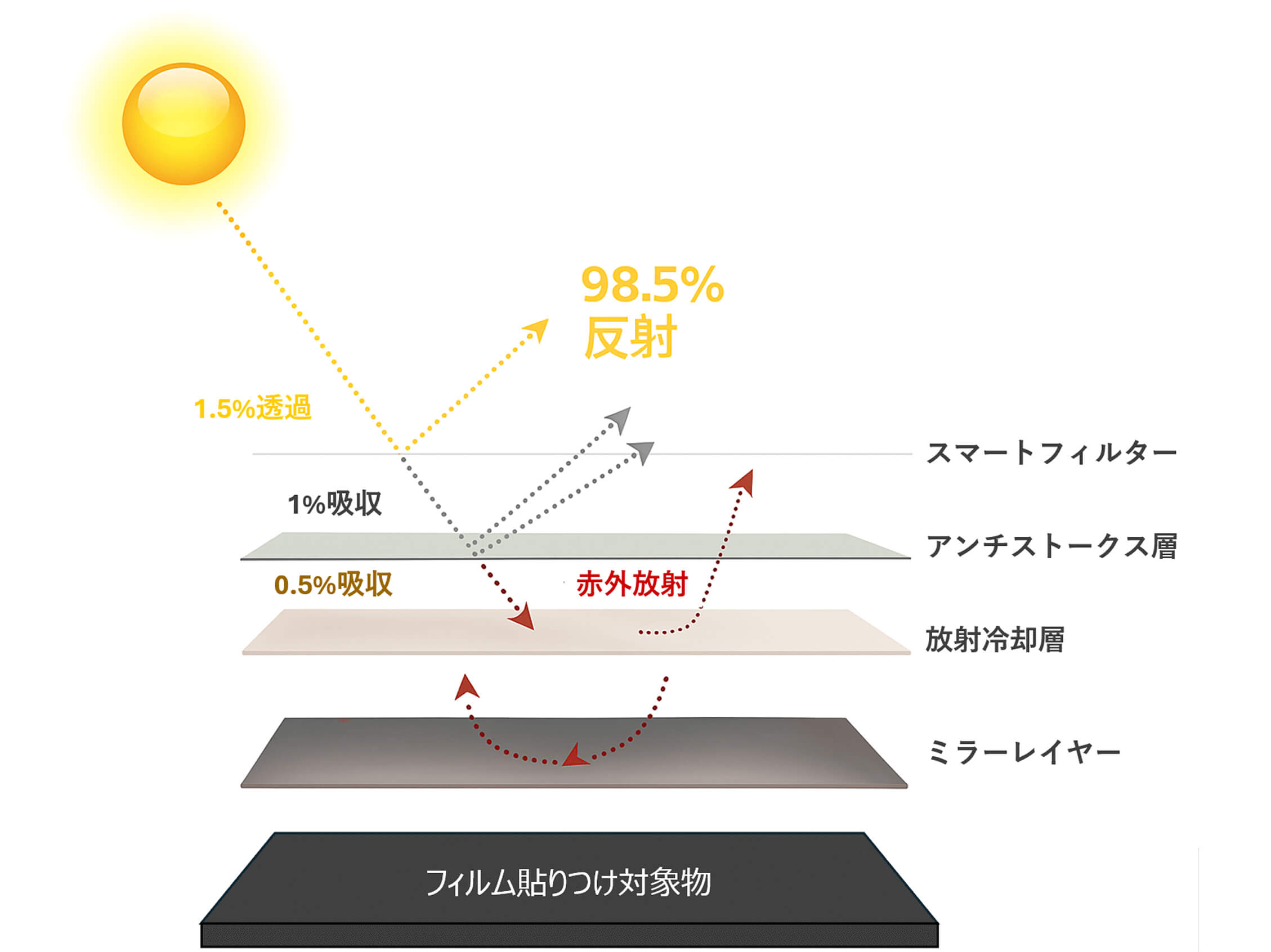 太陽光の98.5% を反射し熱の蓄積を抑える一方で、残りの光を利用したアンチストークス層による冷却と、放射冷却による放熱の組合せにより、電力を使わずに温度を下げる次世代冷却技術を実現しています。