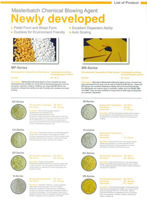 各種発泡剤(OBSH, ADCA, DPT等)やKicker(尿素等)のマスターバッチ。主な用途としてはウェザーストリップやウェットスーツ等の各種発泡製品。